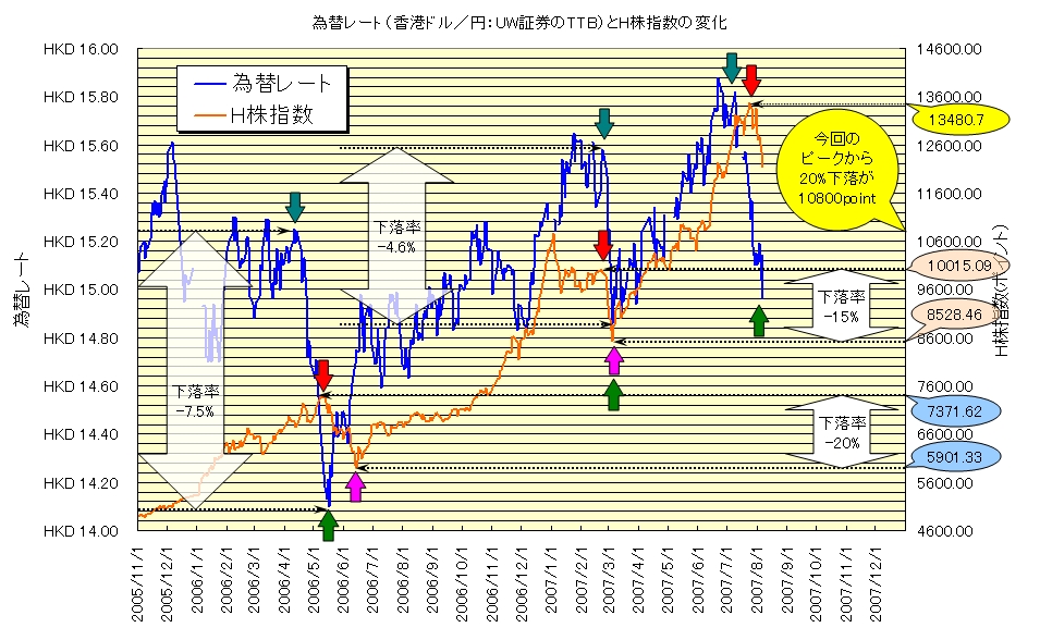 ダウ:-2.3%,S&P500指数:-2.3% と急落したんですよね. 厳選銘柄が30種並んでいるダウの下げはともかく,S&P500も同レベルで下がったようですので,ファンドマネージャーやトレーダーはかなり対応に困ったでしょうねえ. 27日(日本時間28日未明)も,まだダウは1%強下げていますので,月曜日からの世界の市場はどうなりますか. 今回の米国株式市場の急落は,耳にタコができるほど聞いてきた「サブプライムローン問題」の再燃とか原油価格のこととか,まあいろいろ難しいことがあるようですが,私には難しすぎて本質を理解できそうもありません. ですから,その辺りにお詳しい皆さんからのツッコミが来ないうちに話を切り上げて...と.(^-^;;) この米国市場の急落を受けて,27日の金曜日には世界中の株式市場で下げました. HSBCの資料も合わせてまとめると,同じく対前日比で 英国 FT100指数:-3.2% ドイツ DAX指数:-2.4% フランス CAC指数:-2.8% ブラジル ボペスパ指数:-3.8% ロシア RTS指数:-2.5% 中国(香港) ハンセン指数:-2.76%,H株指数:-3.22%,レッドチップ:-3.36% だったようです. 一方,私の7月27日時点香港ドル総資産ですが,これも同じく対前日比で-3.43%でした. 世界の株式市場と同レベルの下げだったということになりますかね. さていよいよその日その時がやってまいります. 今からちょうどひと月前の6月28日,「その時歴史が動いた」でございます. (この部分,松平アナのモノマネ,ちょっぴり“ためる”感じで読んでもらえますと,書いている私は大変うれしゅうございます) 先週の土曜日の午前中の出来事です.